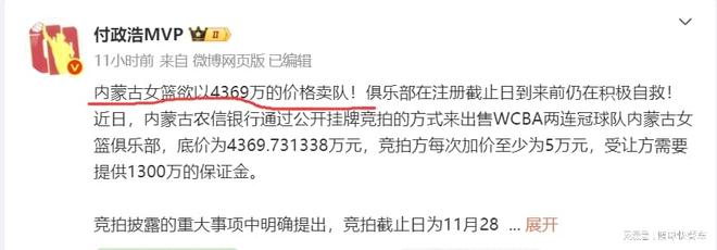 | 中国女篮又一次遭遇打击了。作为曾经的女篮联赛霸主,内蒙古女篮在前阵子传出过退赛后,近日,他们又再度成为了焦点,这一次,他们竟然开始公开甩卖球队了。根据数据显示,内蒙古女篮准备以4369万元的价格卖队,不过,截止到目前,并没有任何企业愿意接手,随着WCBA新赛季注册截止日期的临近,内蒙古退出WCBA联赛,已经是板上钉钉的事实。
