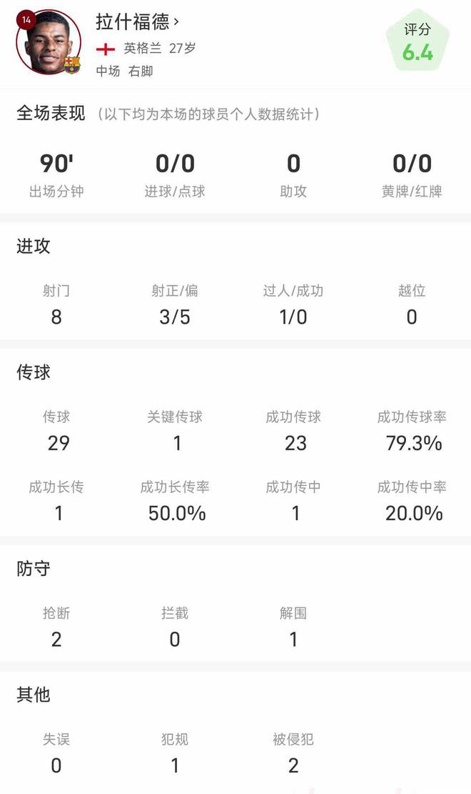 雷速体育10月19日讯 本轮西甲,巴萨主场2-1击败赫罗纳,拉什福德本场比赛踢满了90分钟,未能进球。 数据显示,拉什福德本场比赛出场90分钟,没有进球也没有助攻。 他8次射门,3次射正。1次过人未能成功。 拉什福德29次传球,23次到位,包括1次关键传球。 他有1次成功长传,1次成功传中。 此外,拉什福德还有2次抢断,1次解围。 在场上,拉什福德1次犯规,2次被侵犯。 |