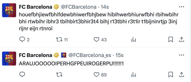 雷速体育10月19日讯 西甲第9轮,巴萨凭借阿劳霍伤停补时的绝杀,主场2-1力克赫罗纳。 在阿劳霍破门后,巴萨官方社媒也激动到胡言乱语,接连发布了两条不明所以的长串英文字符,以表达球队的激动之情。 |