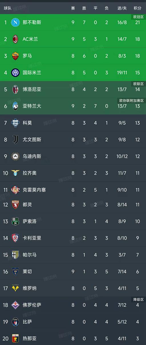意甲第9轮结束了两场比赛,最新积分榜如下!