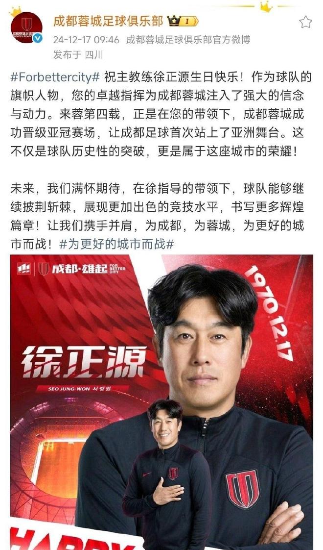 | 北京时间12月17日,成都蓉城主教练徐正源迎来55岁生日,但值得玩味的是,成都蓉城官方没有像过去几年那样,给徐正源送上祝福的海报。